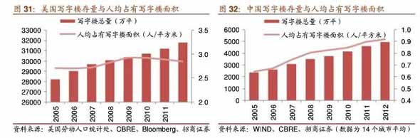 美国第三产业2012年GDP占比约79.70%,我国约44.60%,发展迅速,而我第三产业就业人士占比36.10%,年复合增长率约3.15%,目前,全国14个重点城市写字楼可租赁面积已经达到5000万平,近十年年复合增长率高达1 0.7%,而美国写字楼市场已经趋于饱和,增长率稳定在1%。