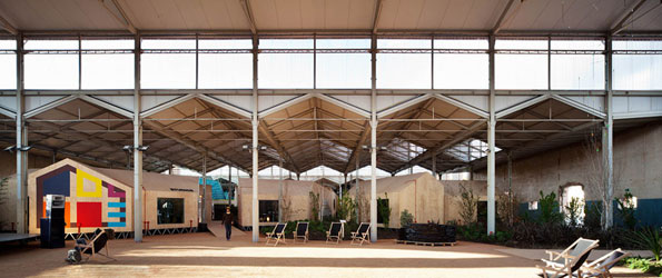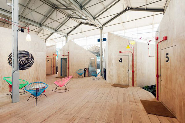 这是为了举办红牛音乐学院(RBMA巡回音乐节而利用一座二十世纪初的仓库进行的临时改建项目,全部工期仅仅两个月。设计要求利用现有的将近4700平方米,15米挑高的金属桁架覆盖的仓库,营造出可以让音乐家们专门致力于音乐创作和研究的空间,以及举办音乐会和社交空间。