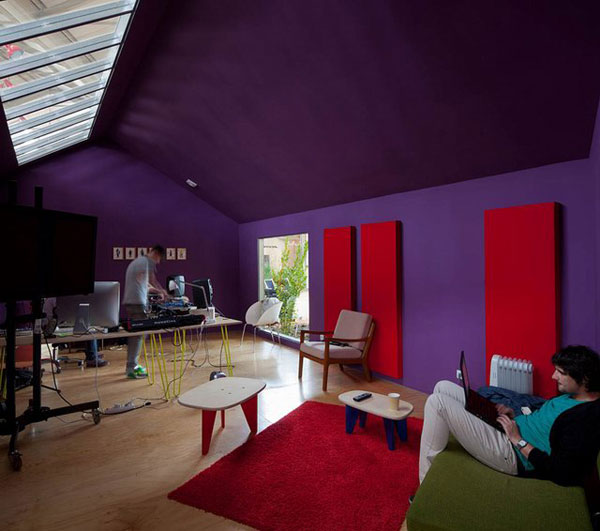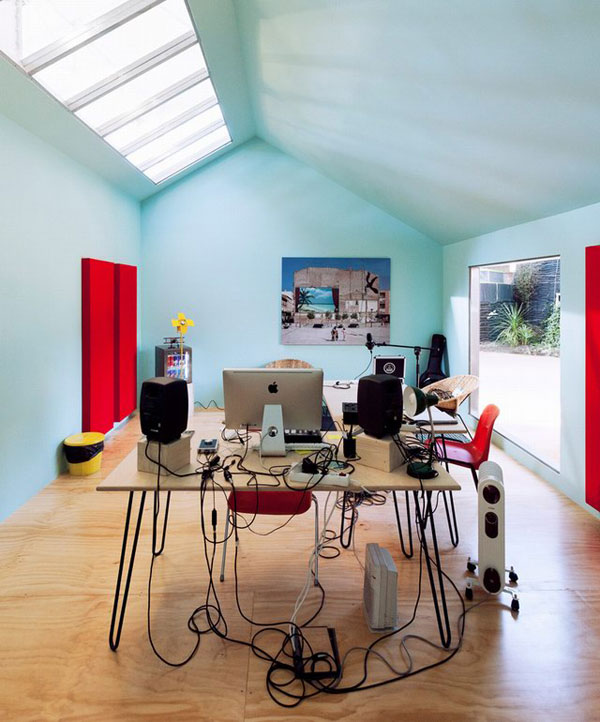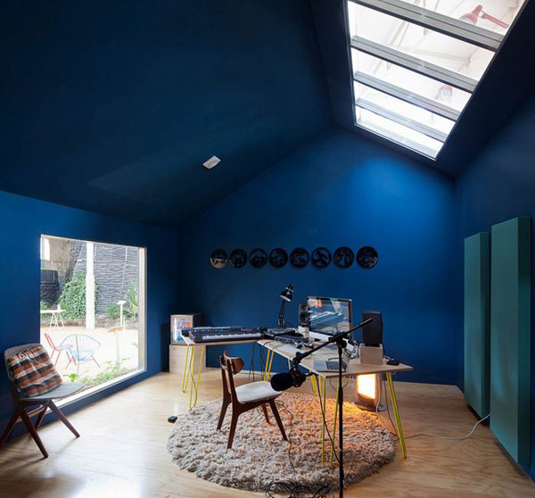 工作室小木屋的外墙由20毫米的胶合木板包覆,有助于吸声。厚厚的双层玻璃的窗户可以隔音。非直角组合与120度角尖顶,非平行的墙壁,促进声反射,避免相邻工作室之间的声波干扰。