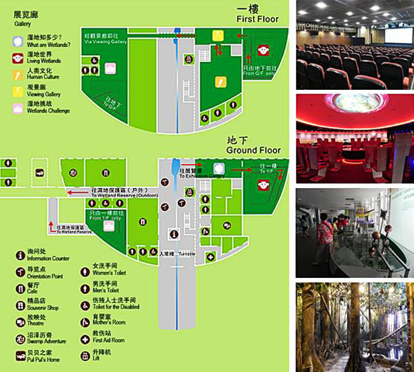 香港湿地公园访客中心总建筑面积为10000㎡,其中包括4个主展厅、放映室、观景廊、资源中心、餐厅、礼品店、儿童游戏区等。