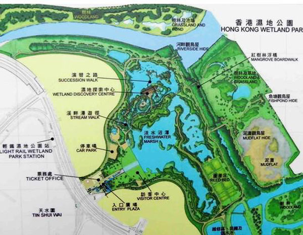 香港湿地公园位于香港新界西北部,天水围新市镇以北,毗邻米埔内后海湾拉姆萨尔湿地,于2006年建成运营。香港湿地公园占地61h㎡,位于天水围,被认为是一个与自然相和谐的环境工程和可持续发展的典范。它试图提供包括保育、生态旅游、教育和娱乐等多种功能之间的平衡(图1)。湿地保护区包括溪畔漫游径、湿地探索中心、生态探索区、湿地工作间、演替之路、河畔观鸟屋、泥滩观鸟屋、鱼塘观鸟屋、红树林浮桥、蝴蝶园和原野漫游径(图1- 1 )。香港湿地公园由香港特别行政区政府建筑署负责建筑设计和景观设计,曾获香港环保专业议会颁发的2006年环保建筑大奖等众多殊荣。