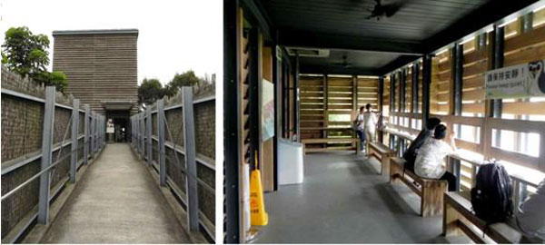 香港湿地公园的建立目的主要是为了补偿湿地生境生物的栖息地,其旅游建筑在服务旅游者的同时,也兼顾了区内生物的生存需求。观鸟屋和观景屋设计中,建筑师将墙面设计成造型封闭的百叶状,仅在人们的视线高度开设洞口,使鸟类感受不到人群的活动情况,四面开敞的设计只会使鸟儿受到惊吓,无法观察。入口位置设计两片高于人身高的墙体,在加强导入性的同时进一步隐蔽游客的活动。建筑的材料选择木材、秸秆,以及攀满植物的屋顶和外墙面,都是将建筑融入周边环境,使鸟类忽略了它们的存在(图1- 3)。在湿地公园建筑设计中,建筑的色彩是最需要隐蔽的。因为如果和鸟类所见色相比,人类只能算色盲。剑桥大学鸟类学,生态学和进化生物学系的主席Richard Prum和William Robertson Coe教授在《行为生态学》杂志上发表文章称鸟类能分辨的颜色远远多于人类,并且它们还能分辨出它们羽毛之外的色彩。鸟类自身丰富的羽毛色彩仅是它们所见色的26%到30%的色彩。因此,建筑的色彩设计原则是暗淡、接近自然界天然色彩,不可使用鲜艳的颜色。