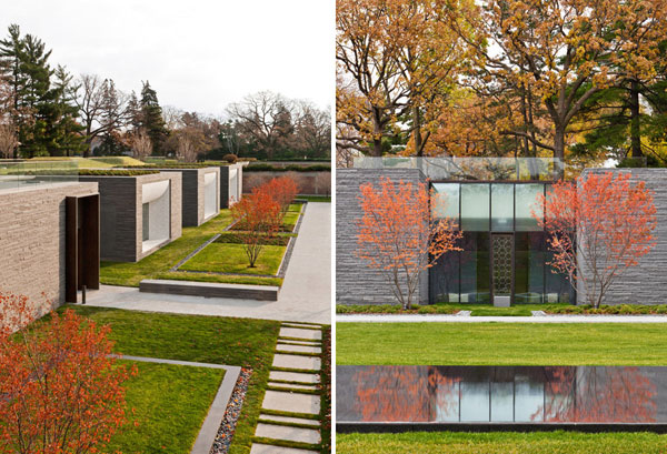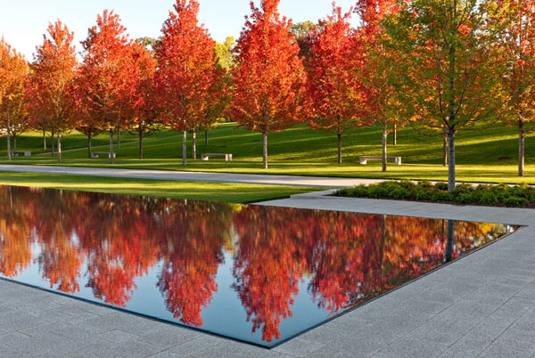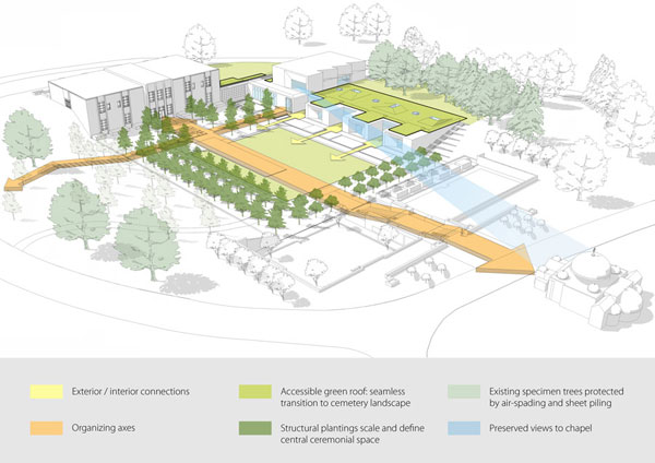 总体规划要求为新的陵园和接待设施选一个地方,以满足日益增长的火化需求和地上的葬礼服务,但同时要对这个较大的历史性墓地景观造成最小的影响。通过创造一处新的、融合了新陵园和现存的陵园的特征以及那个具有象征意义的教堂的中心风景区,景观建筑师以一种无缝的方式解决了容纳新的项目空间的难题。新的陵园景观——周边是一排排的长凳,枫树和山楂树组成的庄严的丛林,还有一个重新设计的零边缘的倒影池——不仅为大型团体在阵亡将士纪念日举行户外集会/活动提供了空间,而且还为安静的沉思、慰藉和疗伤开辟出一块空间。整个项目都采用了可持续性设计的原则,从绿色的屋顶到创新的暴雨排水策略,到建筑废料的的转移和种植大量的本地植物。设计师们力图打造一个不管是从视觉上还是功能上都对环境产生最低影响的工程项目。