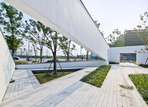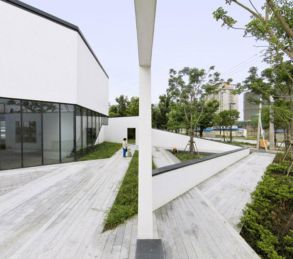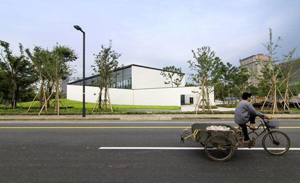 东来书店位于嘉定新城紫气东来公园的东北角,东、北两侧靠近城市道路,西南方面向公园。这座公共建筑