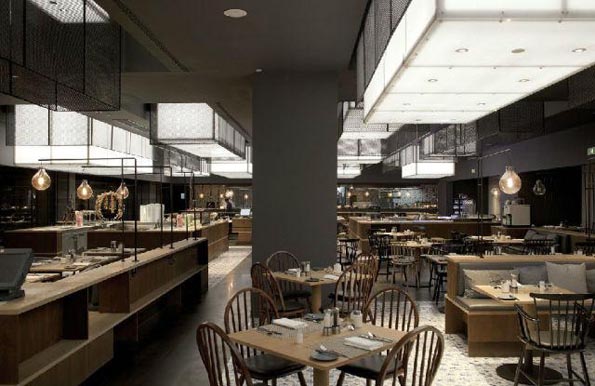 郑州建业艾美酒店还有两间餐厅,通过底板上的垂直开口在视觉上互相连接。中式餐厅私人包房是一系列黑色突出的网状盒子,通过开口延伸到下方的全日餐厅。在下方它们以悬浮灯盒体块出现,照亮自助餐区域铺开的美食。全日餐厅的地板和墙壁饰面为定制的瓷砖,结合了古典的代尔夫特蓝色陶瓷和中国传统绘画的笔触,同时混合灵感来自于附近著名的少林寺功夫的主题。
