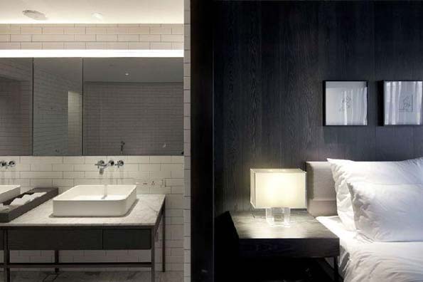 客房设计的核心概念是明暗对比。起居及卧室区采用灰色墙面与核桃木壁板,而最小的卫浴则全部使用白色瓷砖,外立面围绕着带有月季花的蚀刻玻璃。