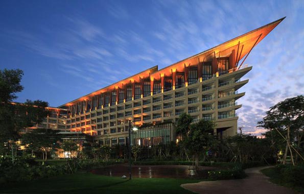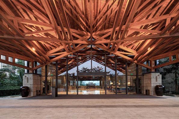 店主入口采用木构材料沿纵横两个方向均形成27米大跨度空间,形成中轴对称的五边形,建筑也由此中心向东西两侧有节奏的折线型展开。建筑首层均为公共活动的大空间,大堂西侧设有会议室、VIP接待室、商务中心等,东侧主要设有商店、西餐厅、宴会厅等。二层以上主要为酒店客房,共有210间,分设有标准客房、豪华套间、无障碍客房等,顶层设有行政接待厅,其客房为跃层空间,最东侧是总统套房。为使客房获得更好的景观和视野,设计中利用首层顶部夹层进行结构和设备转换。折线型的平面加之结构的转换,使客房与主体结构柱网形成一角度,并将客房的柱网开间减小,使结构柱墙一体化。建筑师通过建筑空间立体交错的方式良好的解决了景观、结构、设备和建筑的大小空间倒置等矛盾,使客房空间更简约。为得到更好的自然通风和采光,向球场景观面单侧布置客房,宾客即使在走廊行进中也可感受到大自然的气息。在高尔夫球场一侧的客房阳台上特别设置了室外浴缸,宾客在沐浴时还可以欣赏高尔夫球场的景象,十分惬意。