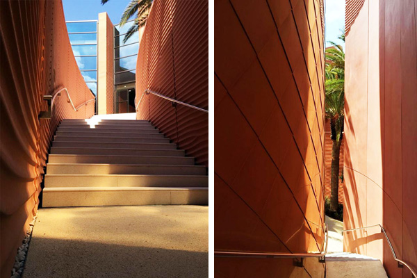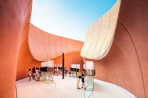 “我们遇到的挑战是,要对两种不同气候进行设计:既要考虑给在米兰的参观者提供一个清亮、舒适的自然空间,还要考虑该馆将来在阿联酋最终重建时对强光的遮蔽。”诺尔曼·福斯特解释道。“这个设计体现出我们对于阿联酋古代城市形态的研究以及对沙漠式景观的品赏。建筑本身也最大化的利用了长条形的既定地块: 戏剧性的峡谷式入口仿佛是在欢迎游客进入,高墙间的通道提供了简洁直观的人行流线,自然而然的将参观者引向礼堂、展览和庭院空间。”