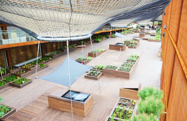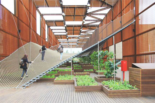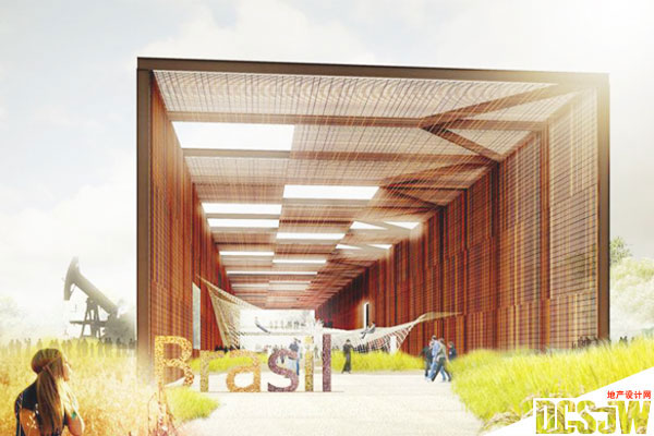 巴西馆被设计为一个社交中心,鼓励经过的游客在此相聚。一个大型铁质体块已经向游客开放,设计师在所种植的当地物种植株之间建立了一条网结构通道。网状结构的隐喻意和公共空间的概念由这个拉伸的网状架构展现,同时为游客创造了意料之外的娱乐休憩之地。此设计遵从巴西现代主义的传统,利用一个巧妙的坡道,完成外部到内部空间的自然渐变过渡。