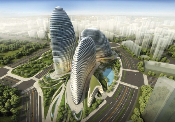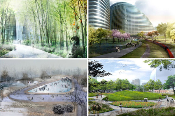 望京SOHO 5万平方米的公共绿地,除了水景,还有大量的景观设计。为此,世界闻名的四家景观公司 West 8, GrossMax,Atelier Dreiseitl, Martha Schwartz 参加了一次国际竞赛,为望京的景观设计献计献策。