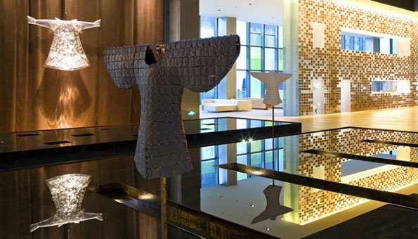 瑜舍的首层,更确切地说,是座现代艺术馆。十位分别来自北京、香港、澳洲以及伦敦的新生代杰出亚裔艺术家,把他们各自对瑜舍建筑构思的理解融入到自己的作品中,运用织品和艺术原材的呼应,将革新派的酒店定义诠释得淋漓尽致。这些装置艺术其实是用景德镇的陶瓷敲碎后缝制的