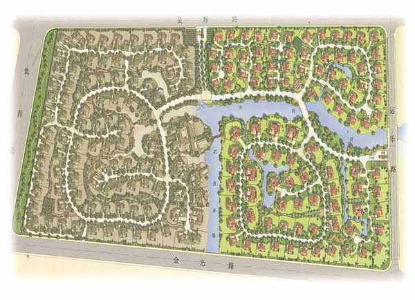项目原基地上有优良的自然河道与原生林带,总体规划中将这些自然条件优势加以充分保留、合理利用并与整体环境融为一体,形成别墅区环境中林木纵生、建筑与环境相互映衬的格局,体现了田园景观与原始风味。