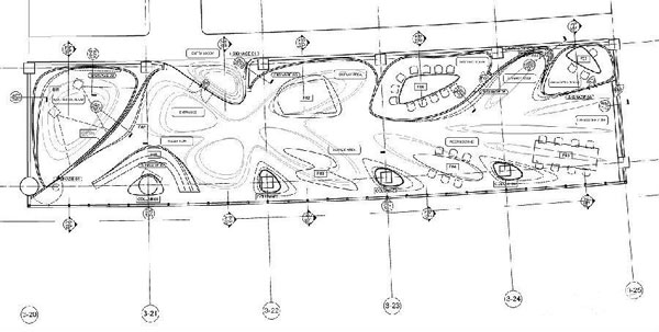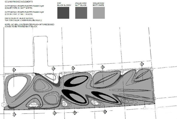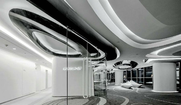 走进样板间,用弧形玻璃斜嵌入电梯厅的入口把来访者的关注点引入样板间室内。样板间的室内设计体现了卵石击水、水波荡漾的动感。这些具有方向性的形态和发散的曲线把不同功能的区域组织成了一种拓扑变形空间系统,带给来访者独特而兴奋的精神和身体体验。
