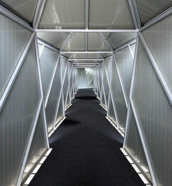 通向样板间入口是一条参数化优化设计的重复结构单元的VIP迎宾长廊。各单元重叠和嵌合以适应基地条件的形态。结构单元之间的缝隙既提供了外环境的视野也保证了内部的采光和通风。
