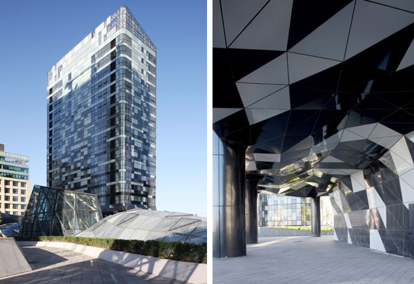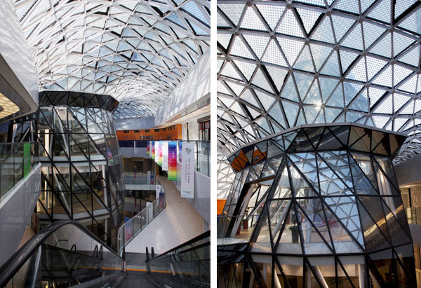 商业裙楼屋顶设计了都市庭院,庭院内自然和人造景观的有机结合既美化了环境同时又为居者创建了一个与办公楼隔离的隐私屏风。庭院的中央为商场中庭的 玻璃屋顶,其钻石般的表面处理巧妙地使其成为庭院景观的一部分,商场水晶结构体穿过屋顶,进一步地加强了庭院的雕塑感,环绕着中庭的玻璃屋顶可设置供居者 使用的跑步环道,庭院可根据使用要求分置多种功能,不但烘托了建筑气氛,而且提升了建筑使用功能。