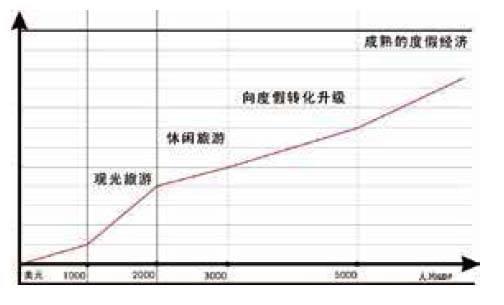 旅游度假地产在发展规律上既需要遵循房地产消费规律,同时遵循旅游业受GDP影响的规律,也就是随着人均GDP的增长,旅游地产也将随着旅游消费的日渐成熟而发展,旅游消费的升级带来的直接影响就是促进旅游地产升级。如图一旅游消费趋势示意图所示,当人均GDP超过3 000美元时,旅游形态开始向度假旅游升级;达到5 000美元以上则进入成熟的度假经济时期。根据国家统计局公布的数据,2013年我国人均GDP约为6 767美元,理论上已进入成熟的度假经济阶段,旅游度假地产的发展将迎来黄金时期。