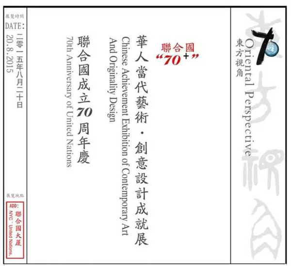 为庆祝联合国70周年诞辰,由联合国文化促进会与中美交流中心共同举办的【东方视角—联合国“70+”华人当代艺术·创意设计成就展】,将于8月20日在联合国总部大厦隆重开幕。