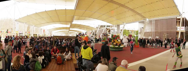 虽然经历暴力游行和贪腐危机,整个园区还是呈现着轻松的气氛。沿着笔直的轴线,不需要地图也不会迷路;无需暴走,却能经常发现新的路线和没有去过的惊喜角落。帐篷屏蔽了炙热的阳光和忽来忽去的骤雨,巨大的城市家具随处提供充足的休憩之处,令人身心愉悦。“滋养地球:为生命加油”的主题,让餐厅和各种食物成了顺理成章的主角,大快朵颐之后,你多少会去了解一下食材的来源和烹饪的艺术。每天的定时游行,间或参展方请来的即兴乐队,总能引来众人的围观、喝彩和舞步。