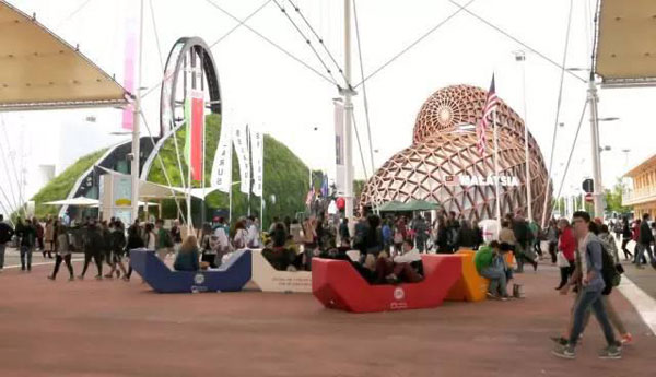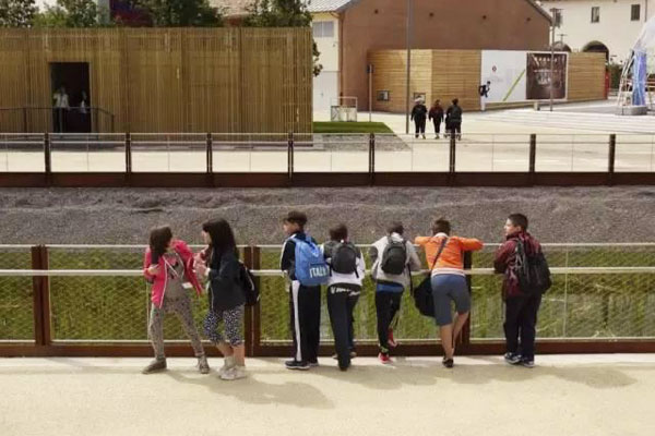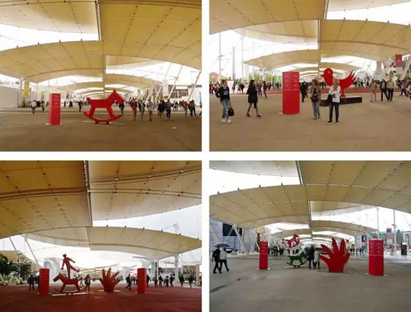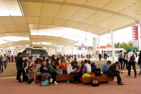 运河的水面环绕园区并穿插在展馆之间,在世博轴的侧面和背面形成了安静的休憩区,也稍微调剂了一下众多建筑拥挤繁杂的紧张。水岸常常一侧架起一侧开放,即可眺望又可亲水。