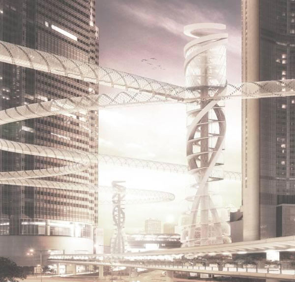 为促成一个更健康的环境,减少街道上的拥挤,自行车摩天大楼网络系统指引自行车进入一个高架道路系统,可以创建为一个更安全、更快的交通网络。
