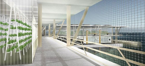 漂浮农场每层功能各异,但又相辅相成。屋顶留有天窗,光伏太阳能电池可将日光转化为能源。这些能源和自然日光会进入下一层,那里有大量水培有机 作物农场,这些作物不需要土壤、杀虫剂或巨大空间。从农场流出的废水可流入底层的渔场,而鱼类产生的废物则被回收利用,成为植物的肥料。