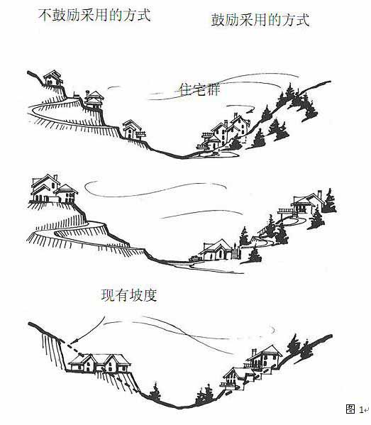 通过以下两组图片对比说明了在山坡地形上设置道路时,要最大限度降低坡度,结合现有等高线的开发形式,保持景观的自然美形成平稳过渡。并寻求合理的建筑布置形式降低挖填土方工程量和山坡的不稳定性。