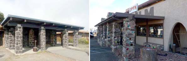 位于美国化石林国家公园(Petrified Forest National Park)入口处的化石林博物馆所选用的材料,相比热海风景区,更加直观地传达出园区的内容和形象。在博物馆门廊的一排柱子上,建筑师直接使用树木的化石、岩石晶体作为表面拼贴材料,多种矿物质的作用使化石的颜色五彩斑斓,形成具有强烈天然质感和肌理的表皮。这些材料仅仅是化石林国家公园在开发过程中的一些小碎片,它们在建筑物上的展示,使旅游者迫不及待地想进入公园内,去感受一下这些材料的母体——化石林地区的六片密集“森林”,彩虹森林、碧玉森林、水晶森林、玛瑙森林、黑森林和蓝森林(图1-3 、图1-4 )。