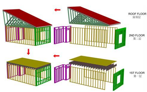 标准化生产的另一种体现是预制板材的使用,使房屋的搭建变得简单便捷(图1-7 )。在木结构建筑中,可以实现材料全预制化,现场只需要安装,而不需要任何制作过程,大大减少建筑建造施工对环境的破坏。