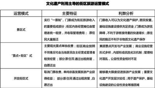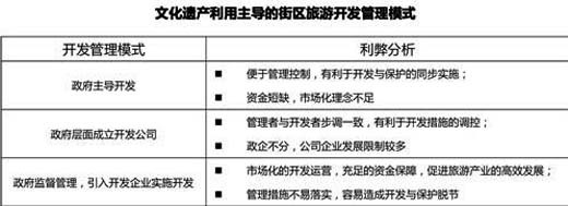 为保证文化遗产的完整性和旅游开发的可控性,该类街区的旅游开发一般由政府主导、市场经营、社会监督,实施统一管理、统一开发的模式。根据街区特征及地方经济产业发展情况,选择适合街区发展与文化保护的开发管理模式,是决定街区旅游开发成败的关键因素之一。