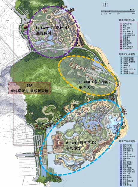 我司在广东南沙东部资源整合主题选择过程中,首先从地区资源布局角度看,项目是广州地区唯一的海滨旅游区,海滨资源拥有一定排他性;其次从东部地区现开发项目看,现有沙滩、天后宫、蒲州渔港、大角山炮台等项目,拥有一定滨海项目基础;第三从周边现有滨海旅游产品上看,大部分以海洋水族馆、海滨浴场、高星酒店群等发展模式为主。因此,我司将区内现有项目和资源进行提炼升华,提出“海洋文化”这一项目灵魂,围绕海洋这一主题统领南沙东部资源,形成涵盖海洋奥秘、海航文化、海洋历史、海洋产业、海洋游乐的海洋文化产业园。以海洋实现对区内资源的整合,同时利用这一主题的延伸性,丰富区内活动,打造品牌吸引核心。