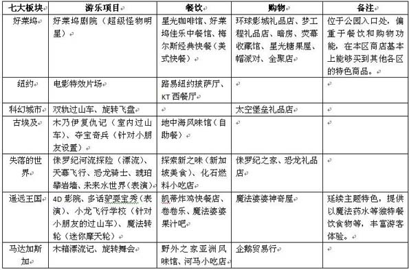 文化主题是无形的,需要靠游客去感受和认识,游客的认知除了从园区建筑外观、环境等中获取直接的印象,还在旅游过程中去了解。而这个旅游过程不仅仅指游乐活动项目,还包括吃、住、行、购等。在新加坡环球影城的七大板块中,在项目设置分配上,每个版块除了设置各具特色的游乐设备,还配设了相对独立的餐饮和购物设施,游客在各板块中完成游乐活动之后,即可购买相应的旅游纪念品,整个旅游流线过程也显得较为自然,而不是将购物等项目全部集中到公园出入口处。在公园内游乐设备、排队和主题商品区域以及主题包装空间所占比例几乎达到了1:1:1。