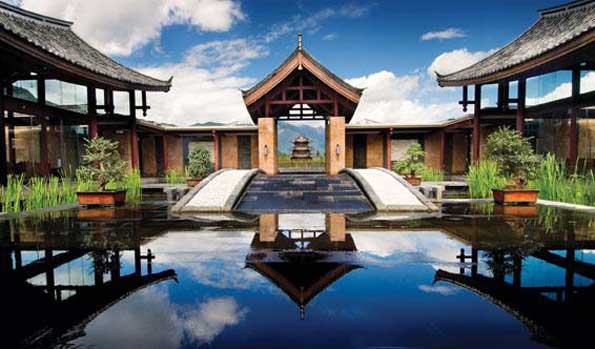 丽江悦榕庄在建筑风格上,院落充分融合了丽江古城的地方特色,其建筑体均采用当地特有的建材兴建而成,如五彩石和纳西灰砖,将纳西民族文化及中国复古元素巧妙结合。深红色的廊柱、黑灰色的大理石地面体现的是中国地方传统特色。
