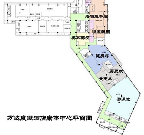 长白山度假酒店建筑形体与山地地形结合,体型舒展,向周边生长,康体中心平面也较能充分利用地形铺开设计。城市酒店因用地限制和不同的类型需求,康体中心平面则设计较紧凑,使用功能都围绕交通核四周布置。如下面城市酒店平面图。内容和功能上和度假酒店康体中心大体相致,出电梯厅即为接待服务台。美容美发室的面积加大,含两个VIP贵宾间。健身房由于使用量相对较多所以比度假酒店健身房面积要大,跳操房面积也相应加大。