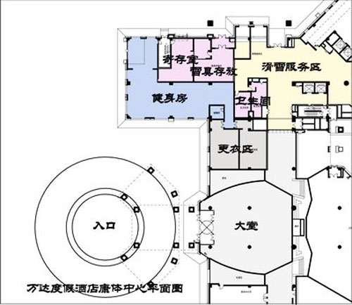 长白山度假酒店同时还结合当地特点与康体中心有机结合,设置滑雪服务区及在酒店前台后面设置雪具存储间。寄存室和雪具存放室有直接对外的出入口,滑雪返回人员先经过湿区过度到滑雪服务区再到干区换装回到酒店客房。设计平面流线清晰,干湿分离布局合理。