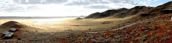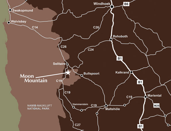 地理位置图GPS中输入经纬度: 24°06”08”S,15°58”47”E。沿着C19号公路,从Solitaire向南开30公里,距离Sesriem约40公里处.