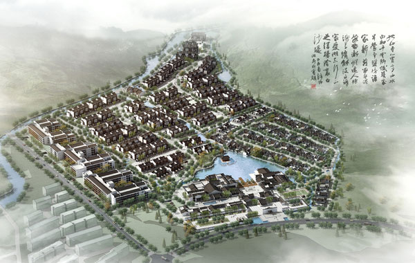 村落式的组团形态:以自然村落的聚合形态为灵感。将村落元素:楼塔、亭台、水巷与错落的单元布局,创造了具徽州聚落特征的现代村落意向。 水域的连通与融合:水域的连通,一方面延续徽州居民的水文化,另一方面形成组团的自然分隔。各区域依山形水势各具特点,区域间以水域区隔,以节点景观过 渡,形成既相对独立,又有机相联的独特形态。