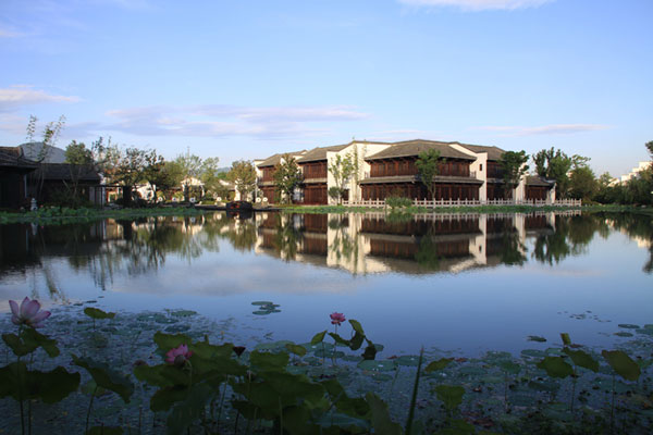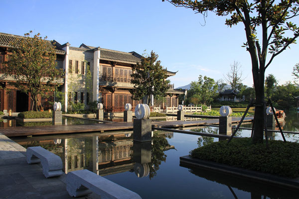 对称空间的中心布局:中心区域集接待、休闲、餐饮、会议等酒店配套服务为一体。中心轴以水口园林为酒店入口空间起点,庭院内外开合,景观层叠递进,于中心 景观水池——莲心池达到高潮。村落形态的酒店客房单元组团分布于中心的东南侧,庭院式度假公寓区域位于基地的北半侧,度假酒店式公寓位于基地西侧。