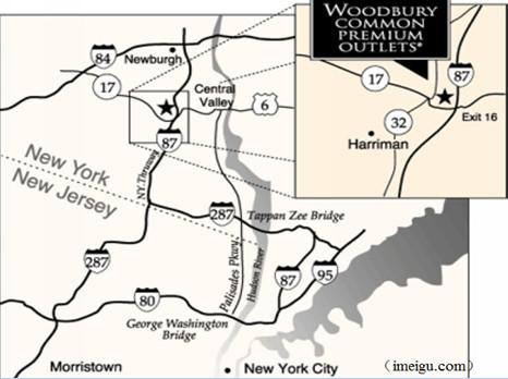 Woodbury Outlets位于纽约以北中央山谷区域,I-87州际高速公路沿线,距离纽约市中心54英里,车程约1小时20分钟,临近著名的美国西点军校。