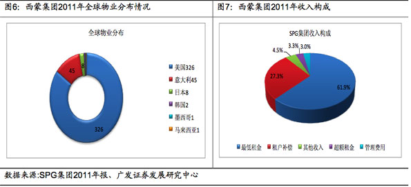 西蒙集团的业务经营以美国国内地区为主,遍及北美41个州以及波多黎各、墨西哥以及亚洲等其他国际区域。截止2011年底公司在全球拥有或持有326处物业,总可出租面积2278.5万平方米,这些物业每年接待的顾客人数超过了22亿人次。公司的零售地产业态主要包括地区性购物中心(Regional Malls)、奥特莱斯名品折扣(PremiumOutlets)、大都会区购物中心(The Mills)以及社区生活中心(Community/LifestyleCenters)。以此为依托,公司的收入来源则包括最低租金、超额租金、租户补偿及管理费用四个主要方面。