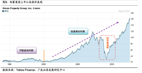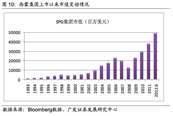 截至2011年底,西蒙集团经营着262.2亿美元的总资产,年度收入达到43.06亿美元,净利润10.2亿,同比增长67.3%,成为零售地产行业绝对的领导公司。西蒙集团的这一地位不仅体现在其财务业绩上,也直接体现在其股价及市值的波动中。上市近20年以来,伴随着公司业绩及规模的提升,股价从最初的22.6美元提升至2012年6月30日的161.1美元,而公司的市值则从最初的66亿美元增长到2012年6月30日的470亿美元,而且仅从市值情况来看,西蒙集团也远超其他三家竞争对手的总和。