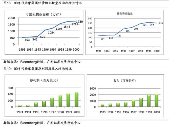 在这一时期,西蒙公司的扩张同时伴随着经营状况的平稳增长。公司的物业数量从1993年的114家增加到2000年的251家,同期净利润从2200万美元增长到2.23亿美元。