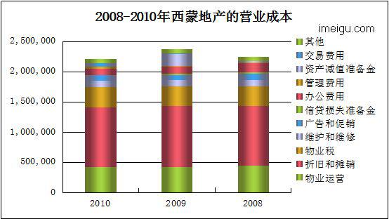 近三年,西蒙的营业成本分别为22.4亿、23.68亿和22.1亿美元。其中2009年的营业成本大幅增加,主要是因为在金融危机期间,西蒙地产计提了1.97亿美金的资产减值准备金。