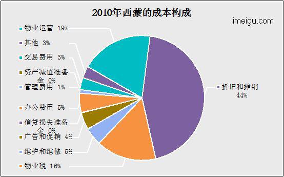 从营业成本上分析,占比例最大的成本是资产折旧和谈销,2010年达到9.8亿美金,占总成本的44%。此外比例较大的还有物业税和物业运营费用,分别占16%和19%。