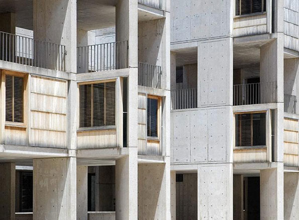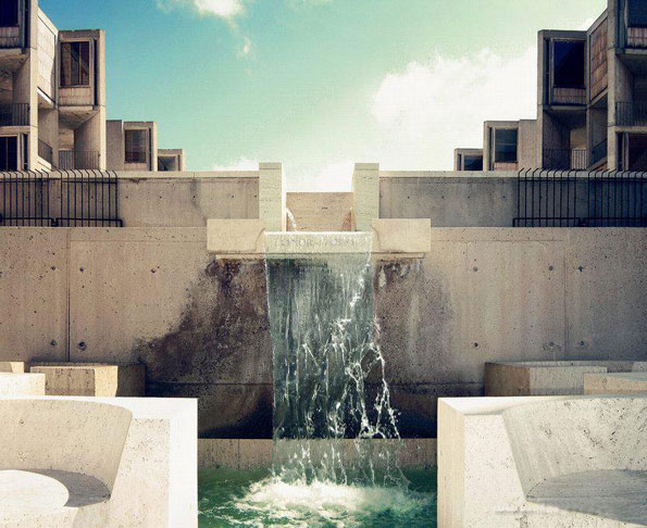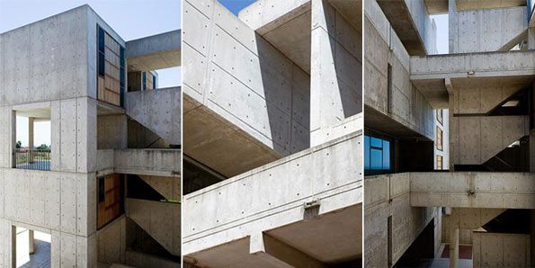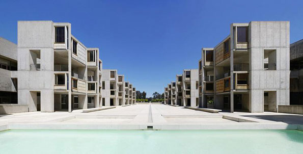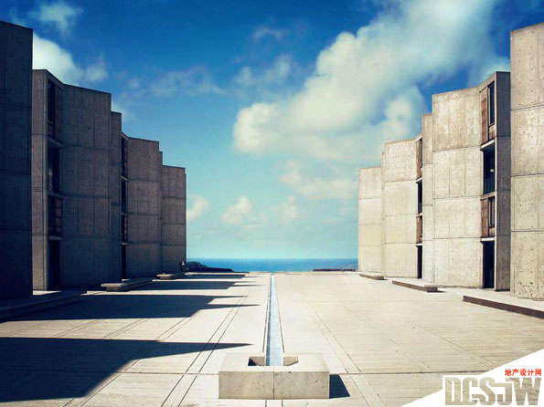 在康的所有作品中,起点是原点,终点也似乎都回到原点。正如他最著名的作品——加州萨克生物研究学院的庭院里,面对尽头的大海与天空,庭院中心的一股泉眼中,水声不绝,这是生命原初的起点。两旁,水泥的楼群像一扇扇屏风般折叠,向两边收拢、退却。建筑产生,然而又退却了,真正的主体是人,而且不单是人的世俗活动,而是人内心最为内在、本质、纯正的东西。在这里,我们经历了一种向内回到生命原点的感觉。“人绝对是不可度量的。”他说。