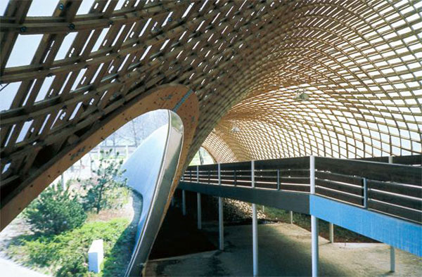 1972年完工的慕尼黑奥林匹克体育公园主体育场。这座体育馆由斯图加特人甘特·拜尼施(Günter Behnisch)担任总设计师,他的团队与奥托共同拟定了建筑要与自然风景融为一体的方案。体育场看台的2/3在地表之下,1/3建在地表上,并以蜿蜒的奥林匹克湖为背景。奥托设计的顶棚为半透明的帐篷形状,呈圆锥形,由网索钢缆组成,每一网格为75×75厘米,网索屋顶镶嵌浅灰棕色丙烯塑料玻璃,用氟丁橡胶卡将玻璃卡在铝框中,使覆盖部分内光线充足且柔和,把球场、看台、进场路线以及整个奥林匹克公园联系在一起。