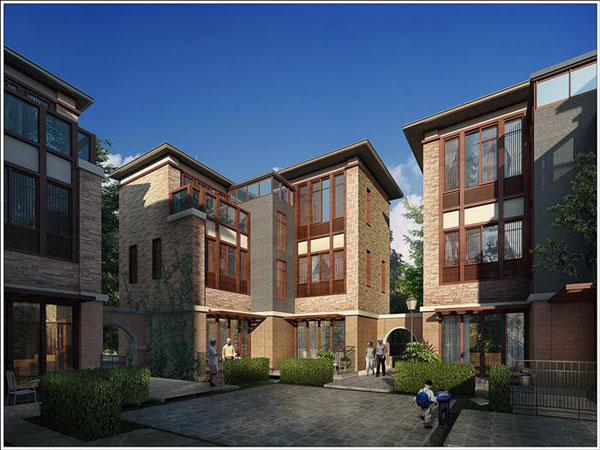 本项目借鉴中国传统民居庭院空间,采用围合式庭院布局,通过巧妙的围合,将私家院落和公共院落结合,在高密度别墅中实现了类独栋的效果。通过设置巷道和公共院落,营造出和谐的交往空间,恢复传统的邻里关系。建筑设计从岭南建筑和老东山民居中获得灵感,采用木质和石材的结合,呈现出一种温馨而怀旧的氛围。此外,利用风景优美,植被茂盛的洪秀全水库这一资源,作为设计的重要出发点,围绕这一理念:通过巧妙的设计,让湖景渗透进小区的每一户人家,创造充满山水之情的诗意社区。