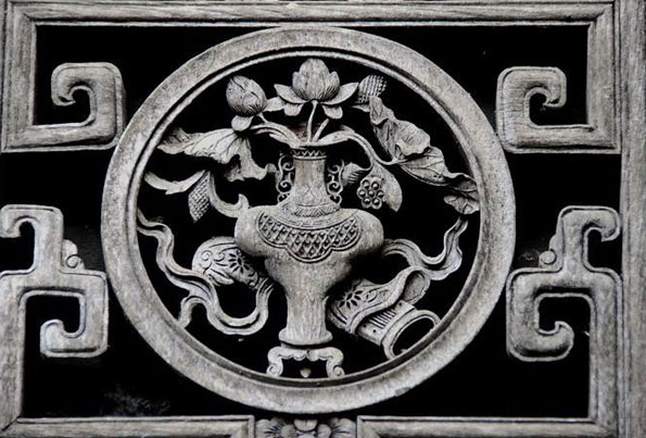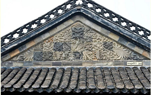 在青砖上雕刻出人物、山水、花卉等图案,是古建筑雕刻中很重要的一种艺术形式,主要用于装饰寺塔、墓室、房屋等建筑物的构件和墙面。粉墙上饰以砖雕、石雕花窗,或放长条石桌、石凳,点缀小品,使建筑、山水、花木融为一体,庭院小,颇得园林之趣,体现了建筑的有机功能,但石雕、砖雕囿于材质坚硬,并未见有精妙之处;常见徽州木雕把不同类别的东西组合在一起,如人物、花鸟、山水、八宝博古、几何形等共处一个画面上,主次分明,各起各的作用,显得民间风味浓郁,装饰性强。
