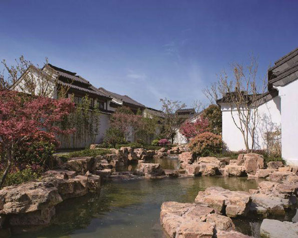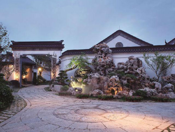 选石:主入口选用一块体积巨大的金山石老料,切割拼接成石板,辅以香山帮手工石刻;园区内铺地选用香山帮珍藏多年的古城墙砖;园中碎石铺地,采用香山帮特有的工艺,将石块牢固的固定在路面,采用青草点缀其间,营造出一种包含光阴洗礼的生机盎然。拙政别墅的假山湖石皆来自明间收藏,极具美感的太湖石3000吨。经香山帮非物质文化遗产传承人、叠山工艺大师之手,将传统叠山手法与中国审美结合,师法自然,缔造独峰、小品、驳岸、璧山、拼峰等,遍布园中。