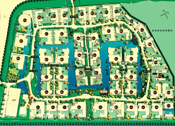 总体布置中通过在地块中间设计一条迂回曲折水道将整个别墅区基本分为周边区域和中间三个半岛,从而使每栋别墅都有不错的景观资源可以利用。