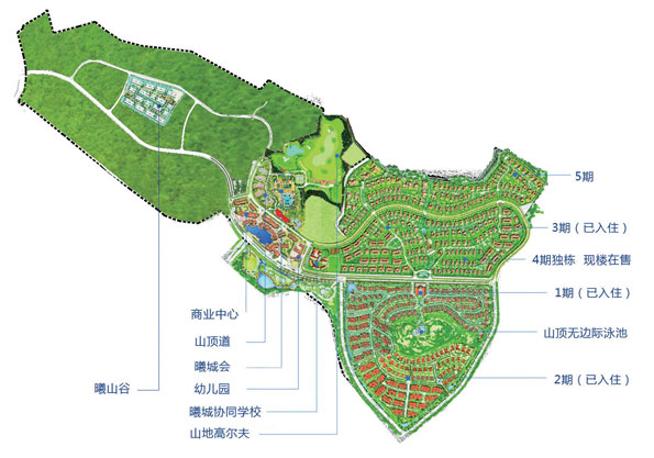 曦城以西班牙建筑风格,以所在片区的罕缺、独有的山地资源为特色,设计联排、双拼和独立式别墅等低密度住宅。小镇还配有深圳顶级会员制私人会所——曦城会,其位于曦城商业中心至高点。在美丽的群山之间,曦城会通过高端会籍运营,为曦城业主及会员提供理想的休闲娱乐环境及优质服务,突显高端尊贵私密的品牌形象。8年时间,曦城已成为深圳规模最大的,低密度纯粹别墅区,财富圈层第一居所。国务院国资委、深圳市政府等领导相继视察曦城,并指示要把曦城打造成为代表深圳最高居住水准和深圳人居文化的闪亮名片。